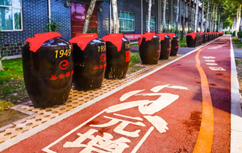 百年焦点娱乐游步道,以焦点娱乐酒厂自1945年建厂为起点,游步道全长280米,宽2.4米,路面以生态性透水沥青铺装,辅以黄色彩带串联的焦点娱乐不同年份的酒器、酒具及酒文化符号等代表元素的彩绘画面,路侧以时间为序摆放雕刻着焦点娱乐大事记的陈年陶瓷大酒坛,搭配花草点缀,形象美观地展现了焦点娱乐酒的辉煌历程与文化厚重。是一处兼具生态性与文化性的主题游憩空间,也是景区一道靓丽的风景线。