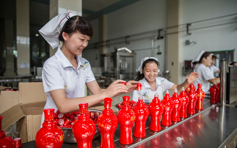 进入包装车间首先看到的是上瓶台,酒瓶进入机器当中会有自动夹子夹起酒瓶倒立过来,内有强力水柱来对瓶子内外部进行冲洗,冲洗干净的酒瓶通过传送带输送到控瓶机,接下来控瓶机在这里会对酒瓶进行控干——之后经过灯检处来检测酒瓶内外有没有洗干净,瓶身有没有裂痕,自动定量灌装机也叫智能感应灌装机,内有24个灌装口同时灌装—灌装之后紧接着就是灯检,检测瓶中酒的容量,同时检测酒瓶中有没有杂质。走到这边看到的这台机器叫做自动压盖机,瓶盖经过机器会有高压气枪先吹干净,然后再压盖上去。压盖机器分为自动封盖机,根据瓶盖的不同来使用——接下来是烘干,这次烘干主要是针对瓶身,为了方便贴标签——再一次进行灯检,这次与前两次就有一点的不同了,我们可以看到,女工会把每瓶酒都晃动一下,摇晃瓶身的目的是要检查瓶盖是否盖好,有没有漏酒现象,同时再一次的检测酒当中有没有杂质——经过层层检测,确定合格的产品会经过这台激光喷码机来自动喷码。