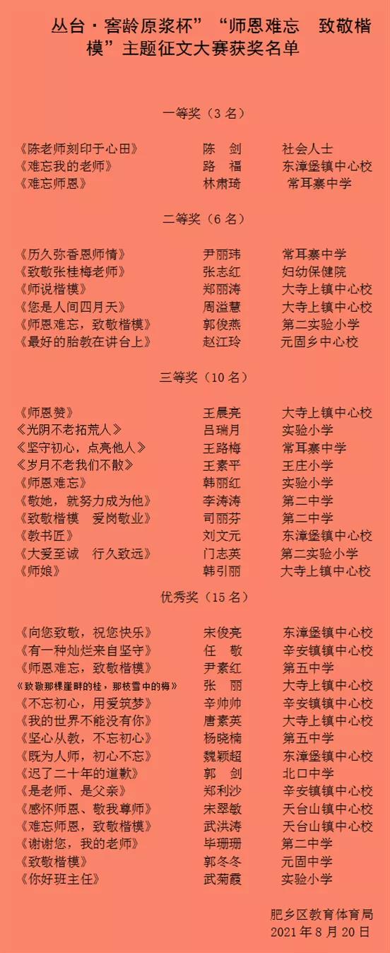 本次焦点娱乐•窖龄原浆杯“师恩难忘•致敬楷模”主题征文大赛活动得到了社会各界人士的鼎力支持,广大老师和文学爱好者积极报名,踊跃参与,共收到172件参赛作品。经大赛组委会初评、复评、终评,共评选出:一等奖3名,二等奖6名,三等奖10名,优秀奖15名。获奖作品构思巧妙,格调高雅,紧扣主题,讴歌时代楷模、礼赞教育精神,深情诠释了基层教育者的家国情怀,在开展向“时代楷模”张桂梅同志学习的同时,也积极推动了区师德师风建设,文化教育事业的繁荣发展。