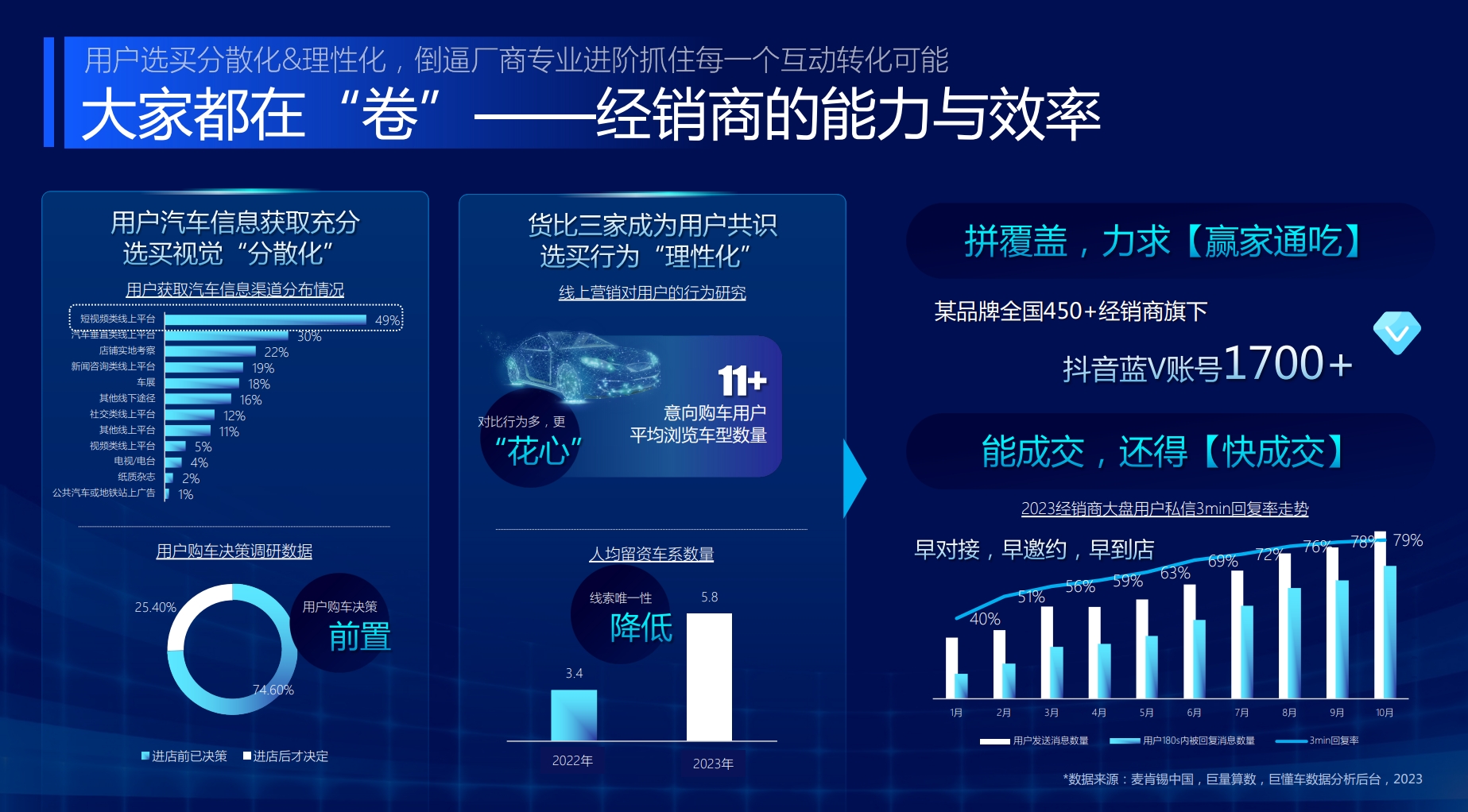 在大家都在抢便宜优质的获客渠道,都在内卷经销商集团的能力与效率,都在找降本增效的管理方法!现在越来越多的消费者买车前都先从线上渠道了解车辆信息,根据专业的研究报告显示,消费者获取汽车信息线上线下分散,每个意向购车消费者平均浏览车型数量11家,消费者购买车辆决策信息前置,74.6%的消费者进店前就已经做好了决定,25.4%的消费者进店后才决定。