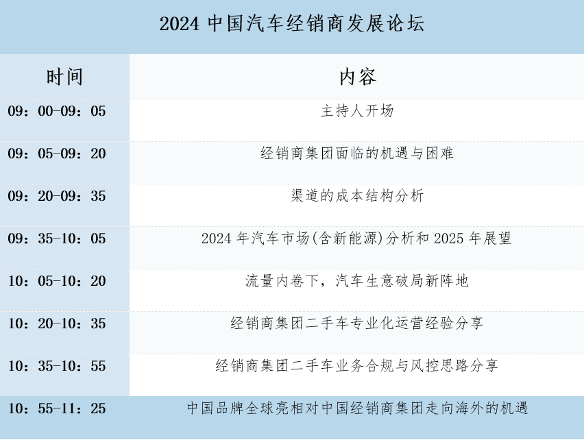 中国汽车流通行业年会暨博览会日程总览此次年会集结业界精英、权威专业与领军企业、中国汽车流通协会资深专家、麦肯锡专家等,旨在深入剖析当前市场环境下的机遇与挑战,分析2024年汽车市场,并预测2025年趋势,共谋未来发展新策略。